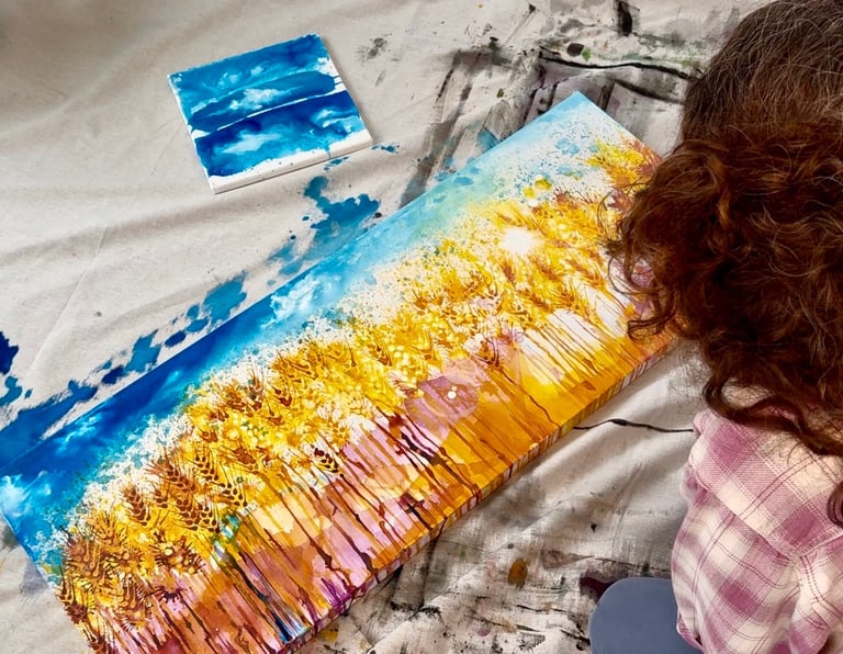 I am an artist drawn to the power of place—those vast, open spaces where color, memory, and spirit intertwine. Acrylic inks let me explore the cultures that raised me: my wheat-farming family, my mother’s Hispanic heritage, the land that formed me, and the sacred spaces that wrap them in wonder. Each piece aims to be a small act of storytelling.